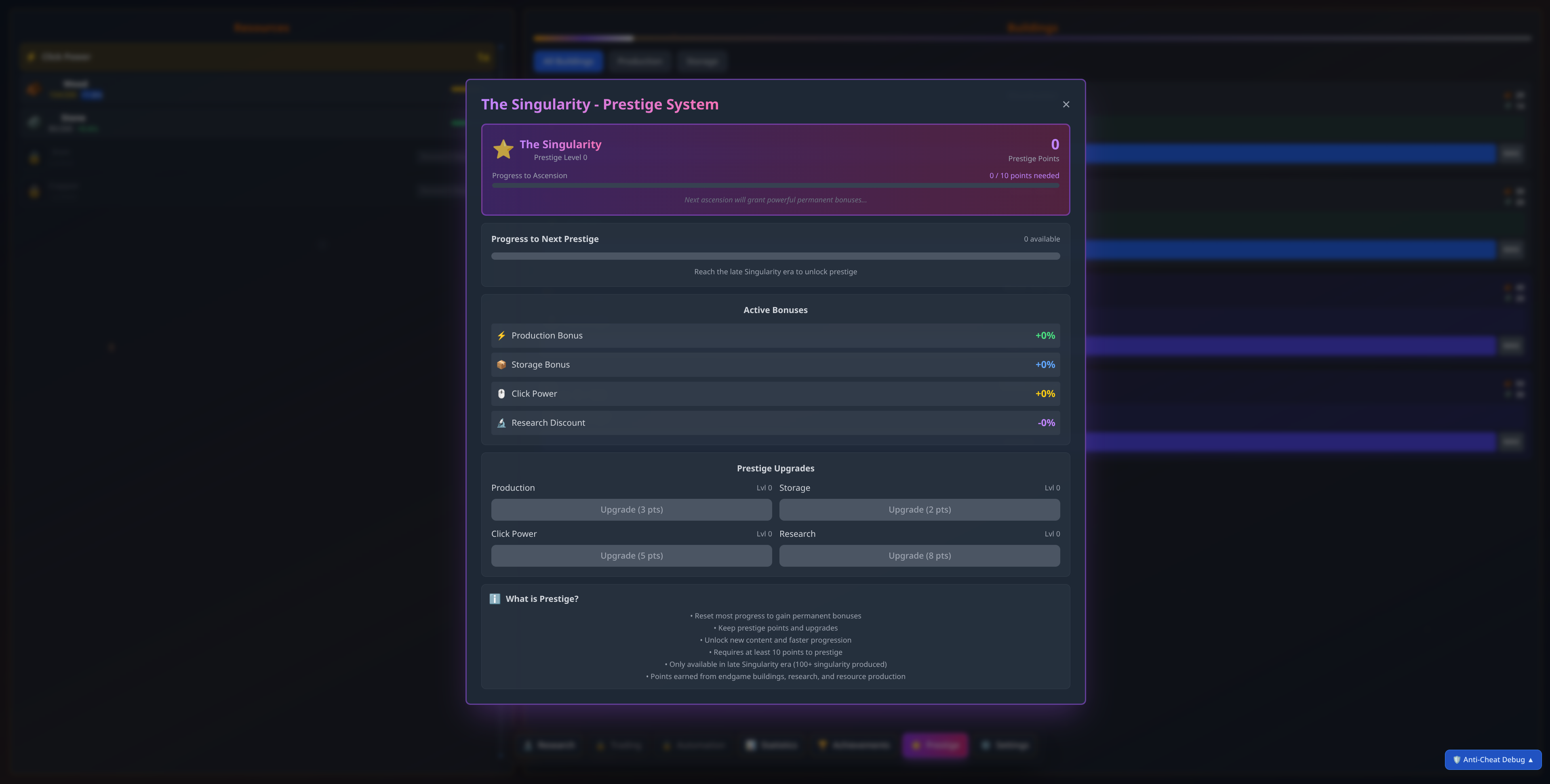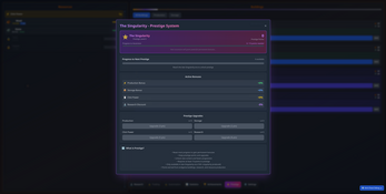 Reset your progress strategically to earn prestige points and permanent bonuses that accelerate future runs. Gain multipliers for production, storage capacity, click power, and research cost reduction.