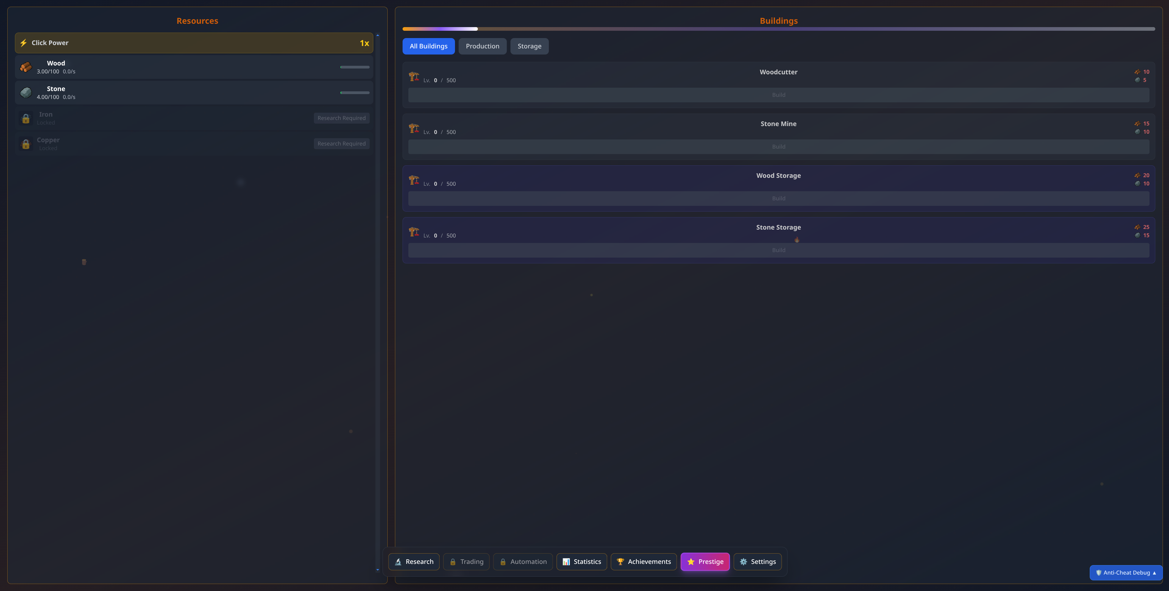 Start by manually clicking to gather basic resources like wood and stone. As you progress, construct increasingly sophisticated buildings that automate resource production. Manage 17 different resource types, from basic materials to advanced technologies like quantum computers, nanites, fusion energy, antimatter, and singularity cores.