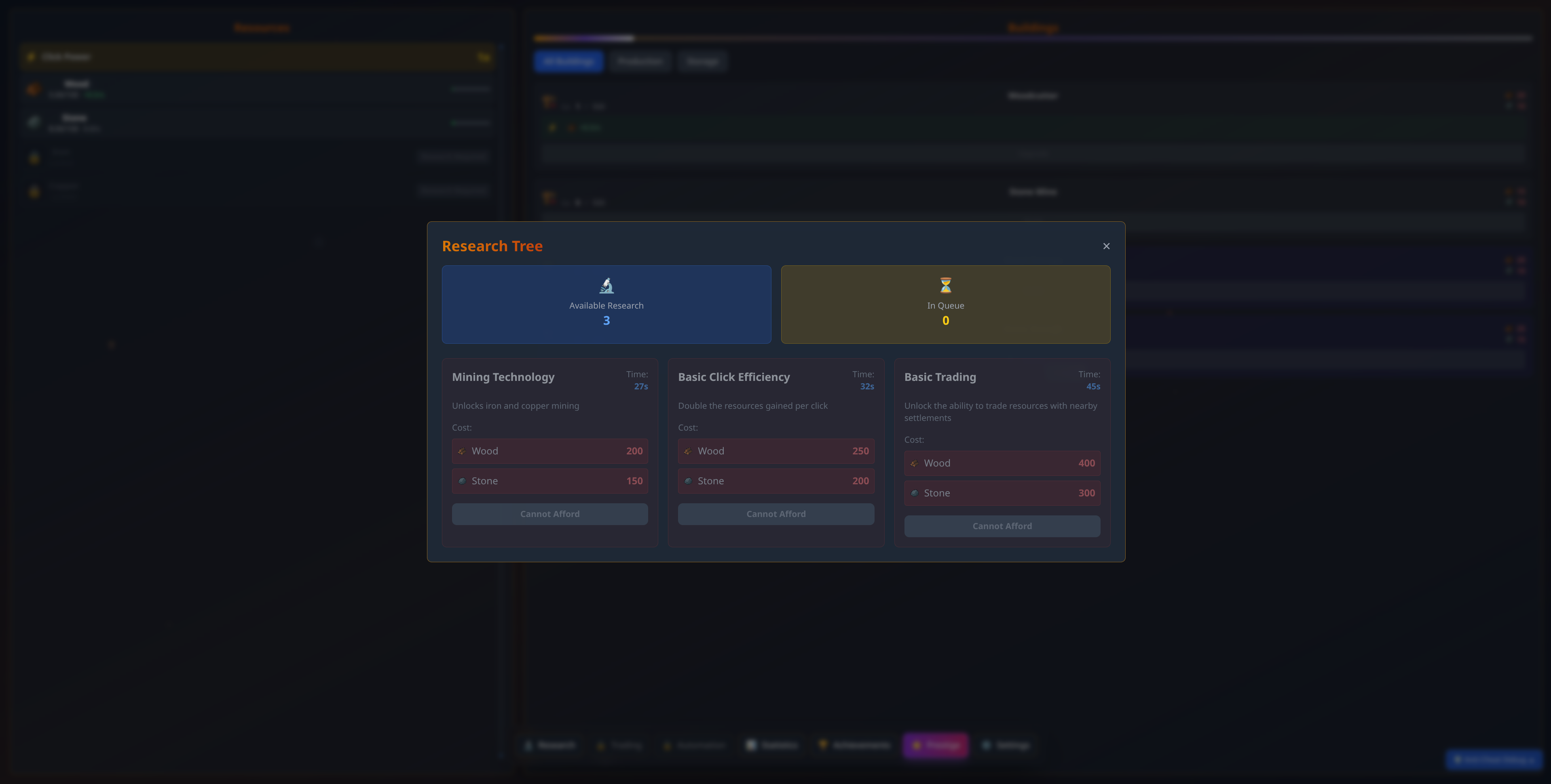 Unlock new buildings, resources, and game features through an extensive research system. Complete projects to advance through technological eras and gain access to powerful new capabilities.